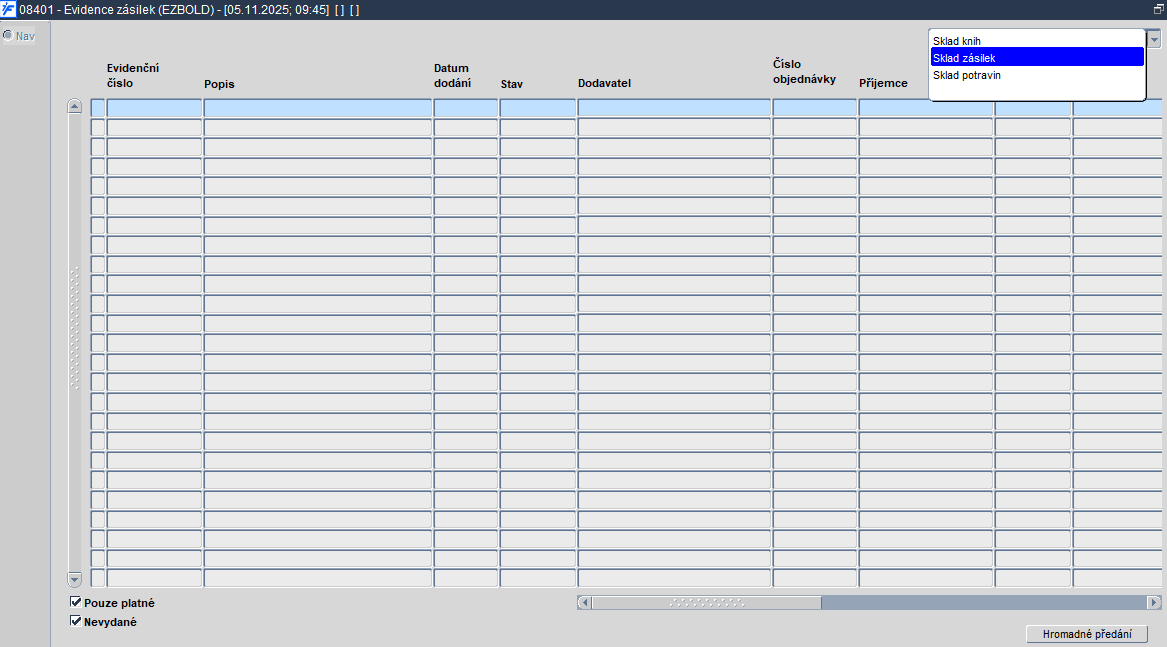 | Předpokladem pro možnost evidence je nastavení správcovských formulářů 08410 - Evidence výdejních míst a ukládacích míst zásilek a 08420 - Evidence volitelných položek. |