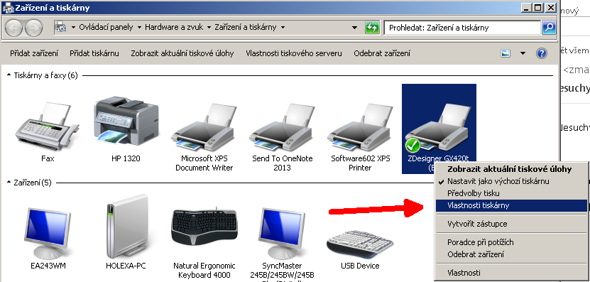 - Klikneme pravým tlačítkem myši na tiskárnu, kam chceme nahrát šablonu, a vybereme možnost Vlastnosti tiskárny