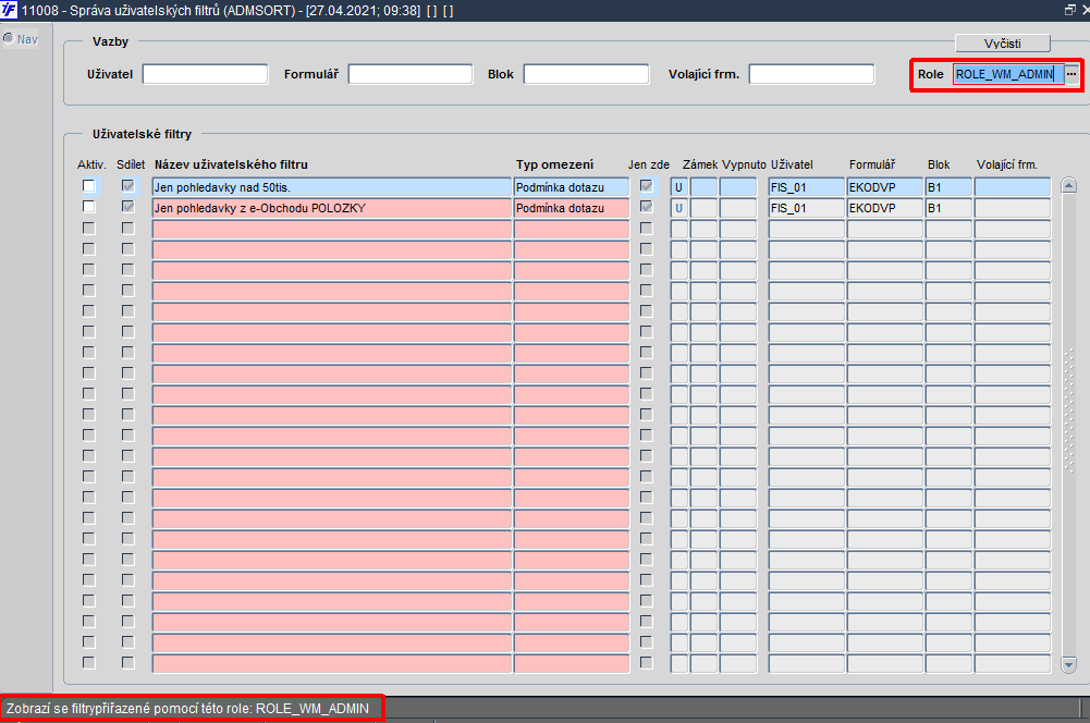 Do formuláře 11008 - Správa uživatelských filtrů doplněna nová položka Role, která umožňuje omezit výběr pouze na uživatelské filtry přiřazené uživateli pomocí zadané uživatelské role.