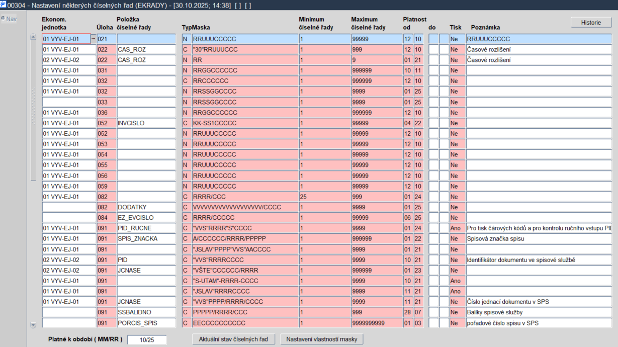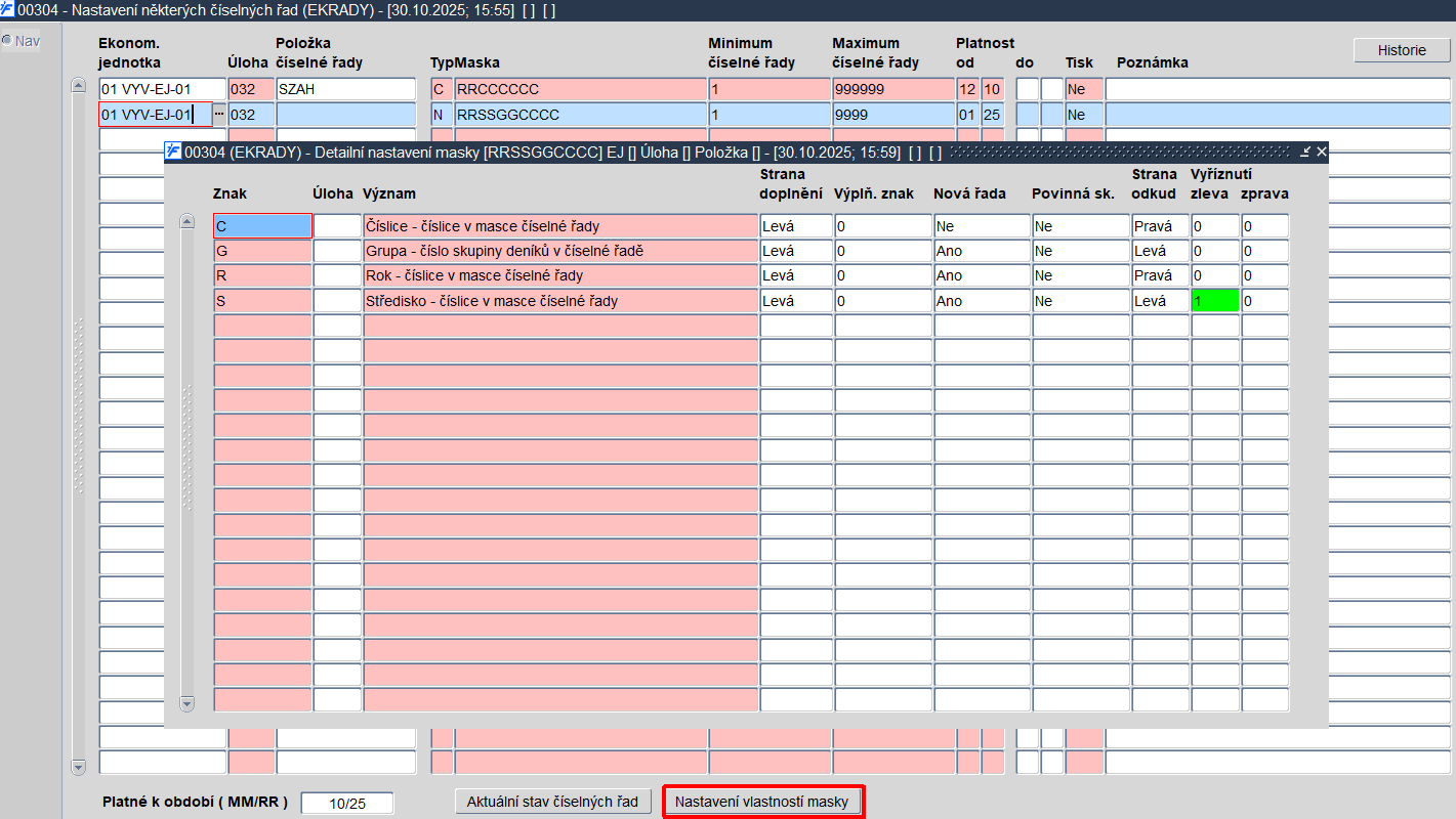 Tlačítkem Nastavení vlastností masky lze vstoupit do nastavení číselných řad a číselné řady zde upravit. Právě zde se nastaví k jednotlivé úloze, jak bude maska vypadat, jaké znaky může obsahovat, odkud se bude přebírat, v jakém pořadí či zda se bude ořezávat hodnota zleva, zprava či se bude brát prostřední část hodnoty.