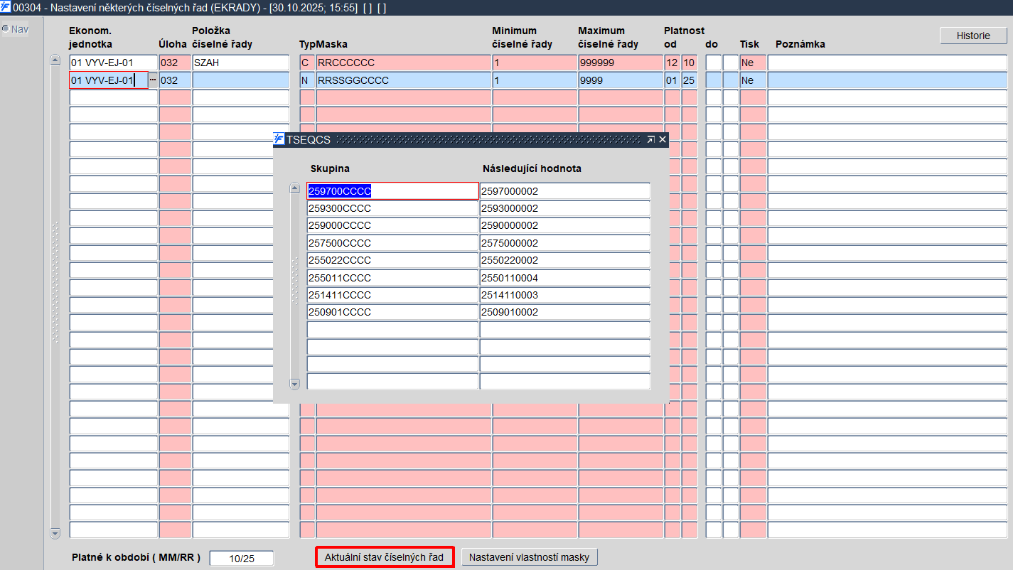 Obr. 00304/2 Použití tlačítka "Aktuální stav číselných řad"
