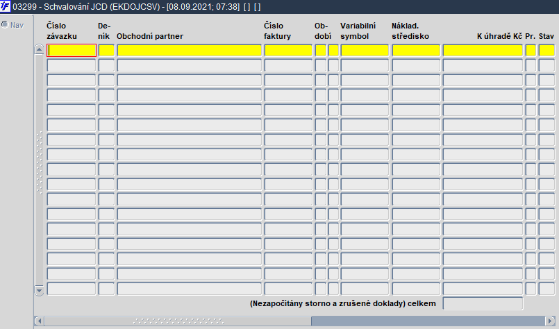 Po spuštění | Po spuštění funkce se na obrazovce vypíše přehled všech neuhrazených nebo do účetnictví nepřevedených JCD, které jsou ve stavu ''Uzavřen'' nebo ''Kontován''. V položce ''Číslo závazku'' je zapsáno číslo, pod kterým je doklad v systému veden. V položce ''Číslo faktury'' je číslo referenční faktury podle odstavce č. 7 z JCD. Po výběru dokladu z přehledu se doklad zobrazí celý. Je možno opravovat pouze čísla bankovních účtů, data pořízení, splatnosti a zdanitelného plnění, číslo referenční faktury, přepínač pro povolení úhrady a důvod pozdržení úhrady. Volbou ''Faktura'' z okénka si lze prohlédnout referenční fakturu. Účetní likvidaci u JCD provádíme obdobně jako u dodavatelské faktury. | ||