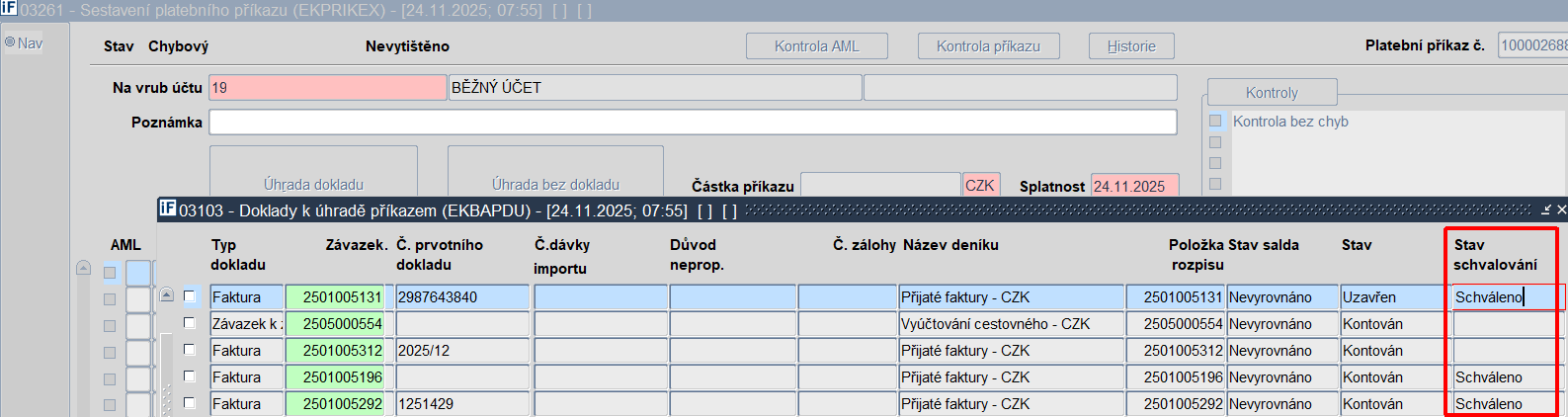 Obr. Sloupec "Stav schvalování" ve formuláři 03103 - Doklady k úhradě příkazem