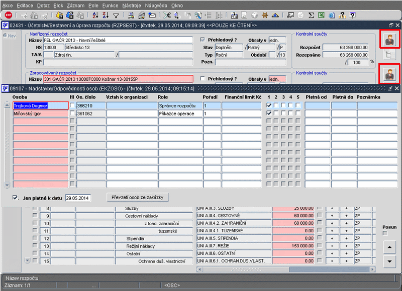 Pro každý rozpočet je možné nadefinovat zodpovědné osoby. Po kliknutí na ikonu se objeví formulář 09107 - Odpovědnosti osob. Jedna osoba může být u rozpočtu evidována vícekrát, pokaždé však s jinou odpovědnostní rolí.