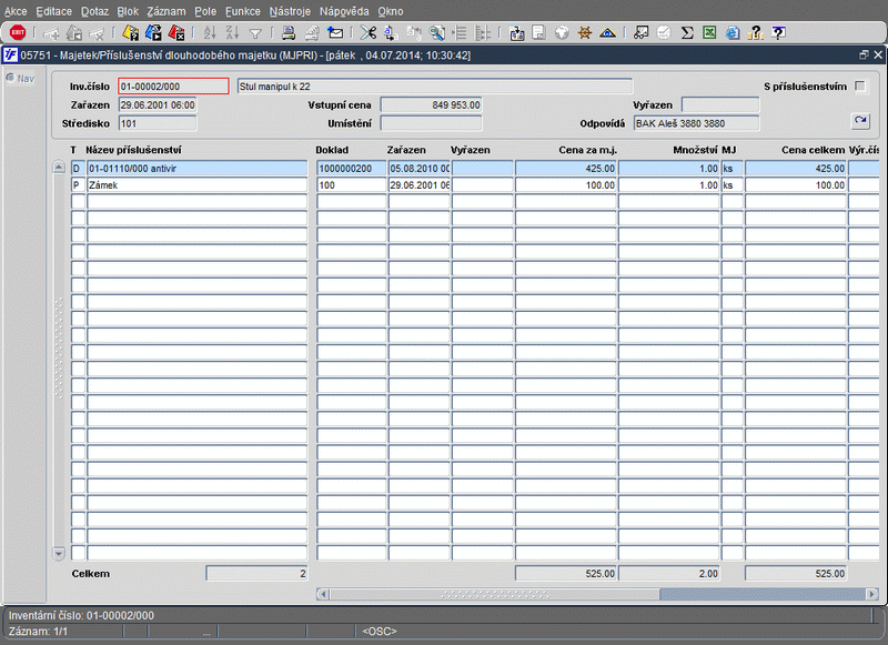 Stiskem klávesy Výběr na záložce "Příslušenství" - volá funkci 05701 - Příslušenství k investičnímu majetku. Formulář 05751 - Příslušenství dlouhodobého majetku, zobrazí všechno příslušenství, které je přivázáno k tomuto inventárnímu číslu.