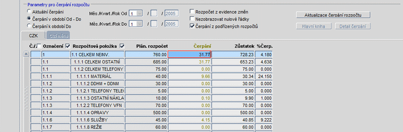 - Čerpání za období OD - DO s možností čerpání z podřízených rozpočtů a z evidence změn