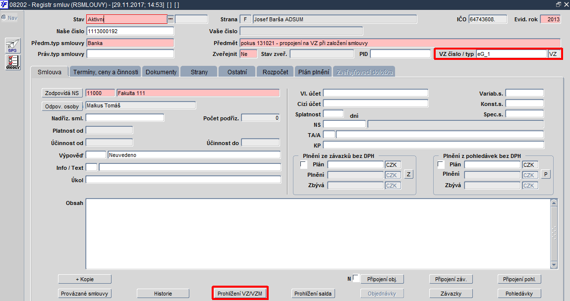 - tlačítko "Zodpovídá NS" - nestačí-li údaj o jednom zodpovědném středisku, použije se tlačítko na připojení dalších středisek ke smlouvě, kontextový přístup je pak funkční i na takto připojená střediska
