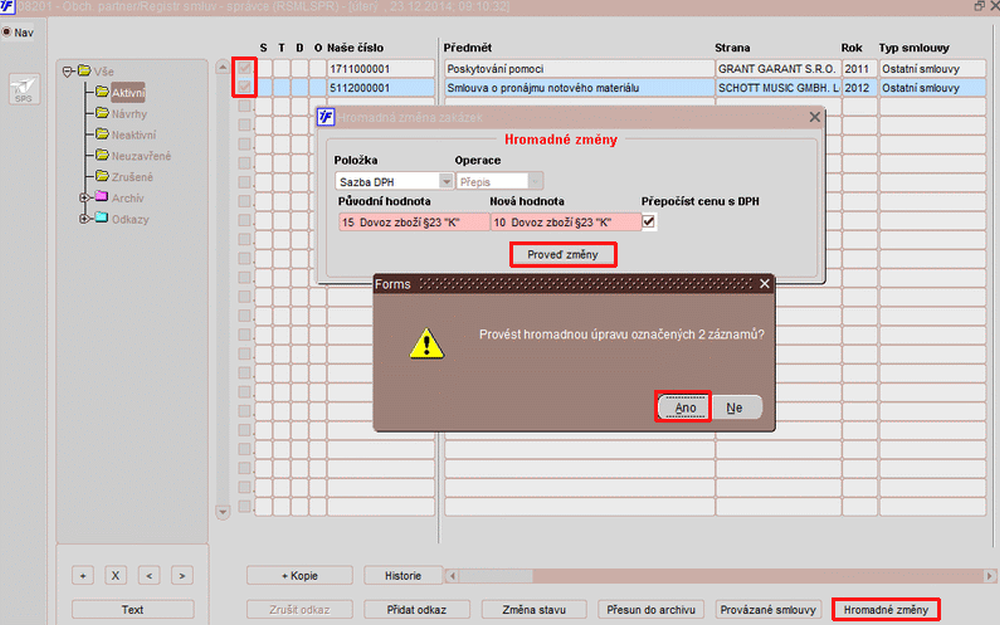 V důsledku změn sazeb DPH jsou umožněny hromadné změny sazeb DPH v iFIS*Registr smluv/Termíny/Ceny s podporou přepočtu cen včetně/bez DPH. Hromadné změny tak byly kromě možnosti nastavení konce účinnosti u více smluv najednou rozšířeny o možnost hromadné změny sazby DPH. Hromadné změny lze realizovat buď přímo ve formulářích 08201 – Registr smluv - správce a 08202 – Registr smluv, nebo: