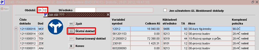 Obr. Aktuální otevřené účetní období 01/12 a vytvoření účetních dokladů například ve formuláři 03540 – Vytvoření úč. dokladu pokladny