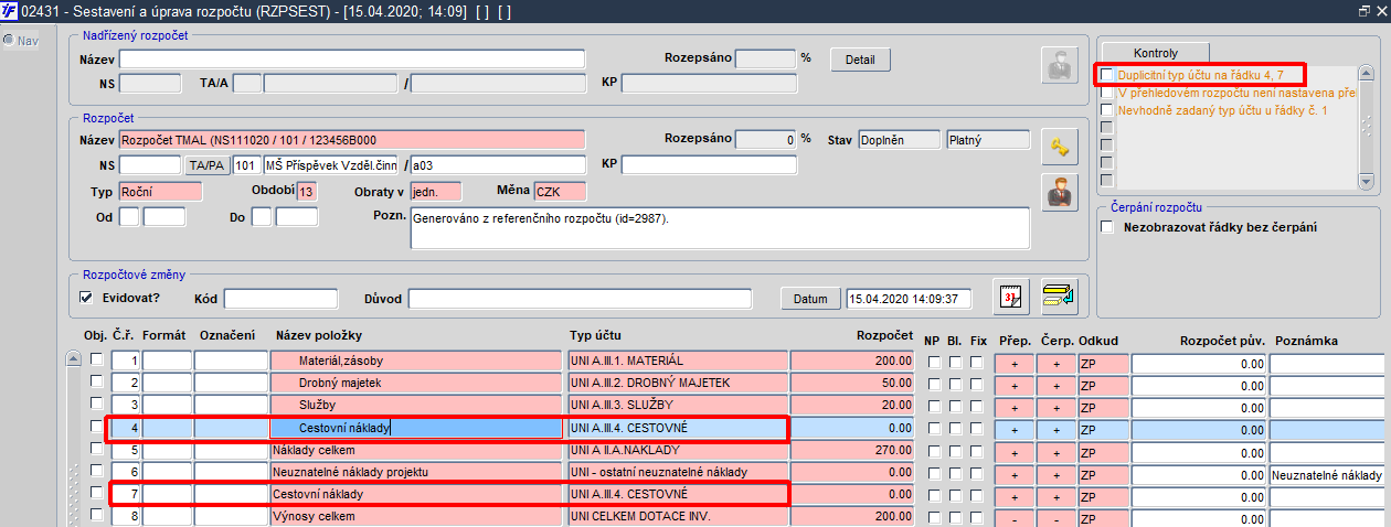 Obr. 02431/10 Upozornění na duplicitní typ účtu na řádku rozpočtu a nepřístupná tlačítka pro přepočty