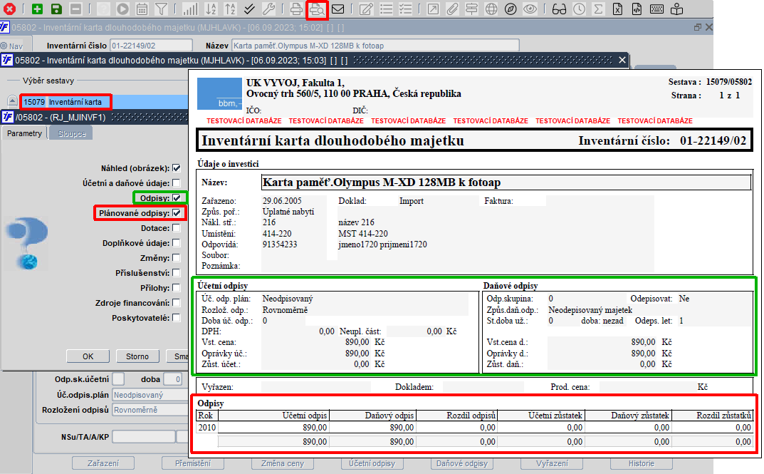 Obr. Nové zatržítko a tisk plánovaných odpisů na sestavě 15079/05802 - Inventární karta