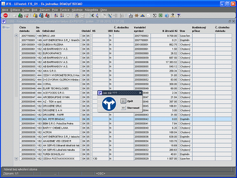 Všechny saldokontně nevyrovnané penalizační faktury, které nebyly stornované, jsou zobrazovány v jediném přehledu bez rozdílu deníků. Klávesou pro Výběr dokladu z tohoto přehledu si můžeme doklad prohlédnout. Pokud jej chceme zrušit, umístíme na něj kurzor v přehledu všech dokladů a použijeme tlačítko Storno. Stav tohoto dokladu se změní na Zrušen. Pokud byl doklad přenesen do účetnictví, vytvoří se storno-doklad s opačnými částkami a opačnými kontacemi. Stav tohoto storno-dokladu je Stornován nebo Storno-nekontován (podle platnosti účetní likvidace). Doklad, který je ve stavu Storno-nekontován, účetně likvidujeme ve funkci 03356 - Opravy penalizačních faktur.