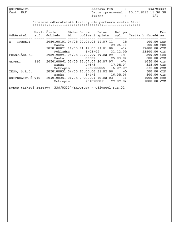 '''Uhrazené odběratelské faktury dle partnera s datumem úhrady.''' | |||