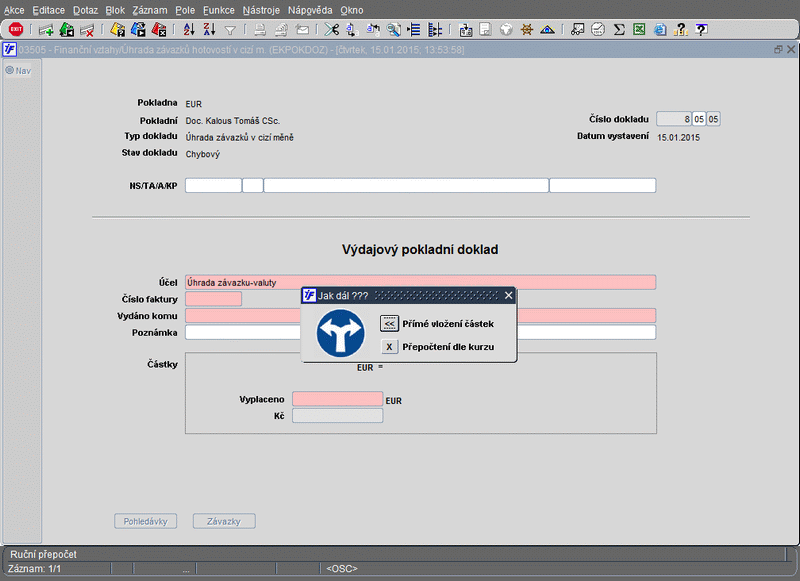 Podle měny vybraného závazku se modifikuje vzhled obrazovky pro vytvoření pokladního dokladu. Jsou tři možnosti: