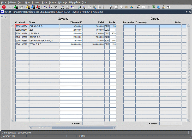 Tato funkce slouží pouze k prohlížení částečně uhrazených závazků. V levé části obrazovky jsou nabízeny částečně zaplacené závazky. Jejich položky se nevejdou do příslušné části obrazovky, proto levá polovina obrazovky roluje po těchto položkách pomocí klávesy pro Předchozí pole. V pravé části obrazovky se objeví částečné úhrady závazku z levé části obrazovky až po stisku klávesy pro Další blok. Úhradou závazku může být řádek bankovního výpisu nebo pokladní doklad. Detail prvotních dokladů je možno prohlížet stiskem klávesy pro Výběr.