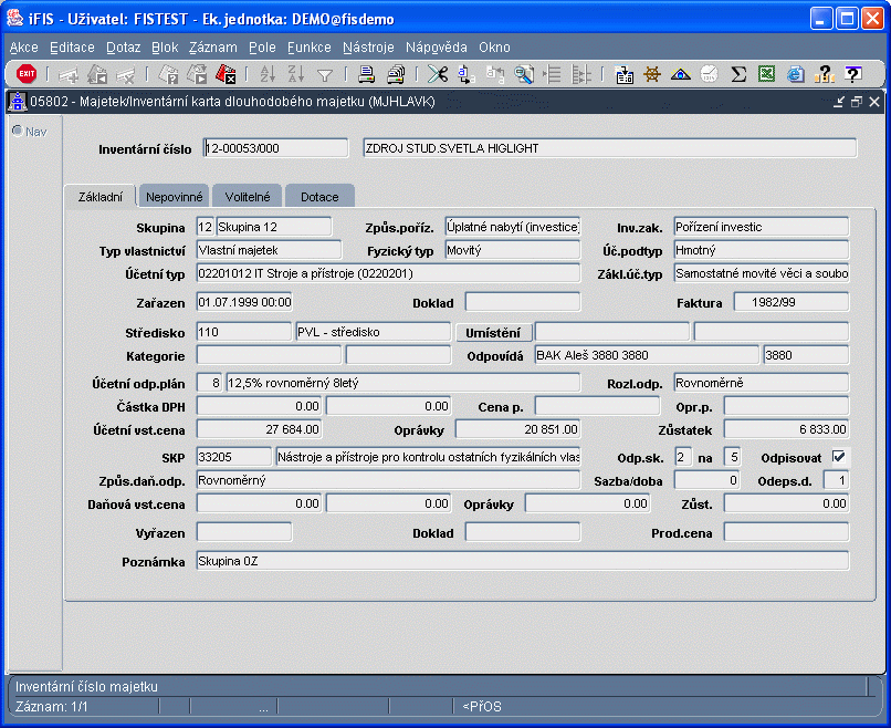 Po načtení údajů a stisknutí klávesy Výběr se zobrazí inventární karta příslušné položky investičního majetku.