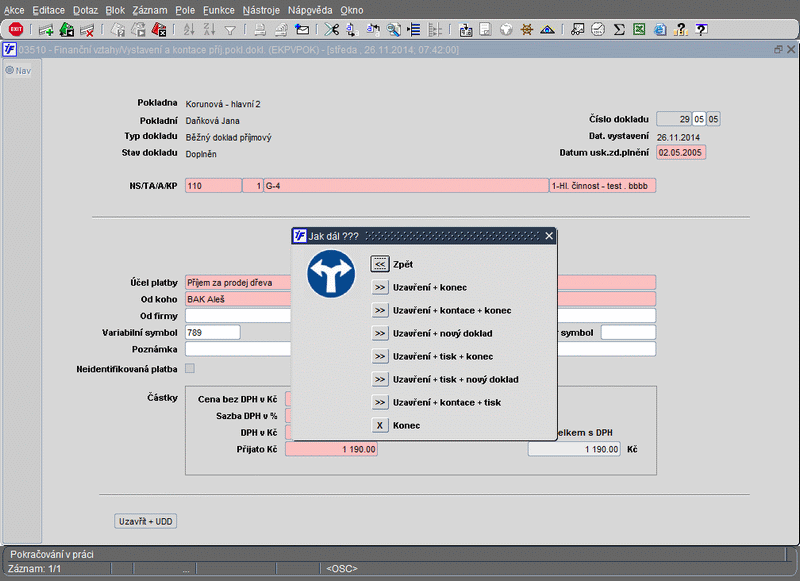 - Uzavření + kontace + konec - uzavře pokladní doklad a spustí ruční rozkontaci (tato volba je přístupná pouze v případě, že je ve formuláři 00302 - Lokální parametry nastaven parametr POK_ROZK na hodnotu "A")