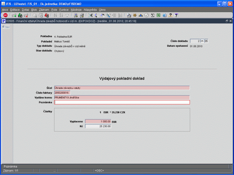 Po proplacení celé zbývající částky se závazek stává saldokontně vyrovnaným. Po uzavření dokladu nelze již údaje měnit. V pokladním dokladu musí být vyplněny všechny položky kromě položky Poznámka.