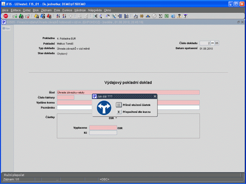 Podle měny vybraného závazku se modifikuje vzhled obrazovky pro vytvoření pokladního dokladu. Jsou tři možnosti : | Podle měny vybraného závazku se modifikuje vzhled obrazovky pro vytvoření pokladního dokladu. Jsou tři možnosti: | ||