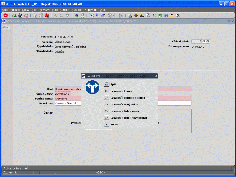 - Uzavření + kontace + konec (uzavře pokladní doklad a spustí ruční rozkontaci). Tato volba je přístupná pouze v případě, že je ve formuláři 00302 - Lokální parametry nastaven parametr POK_ROZK na hodnotu "A".