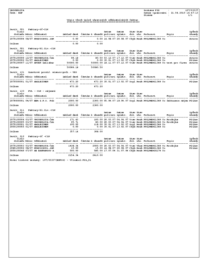 Plně uhrazené odběratelské faktury dělené dle deníků.
