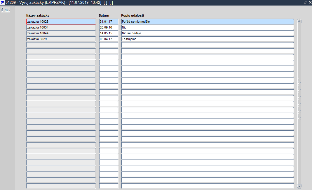 Tato funkce umožňuje k zakázce zaznamenat časový vývoj. V jednom záznamu je možno k vybrané zakázce zapsat datum a textový popis události ve vývoji zakázky. Záznamy jsou graficky rozlišeny na dvě skupiny podle aktuálního data.
