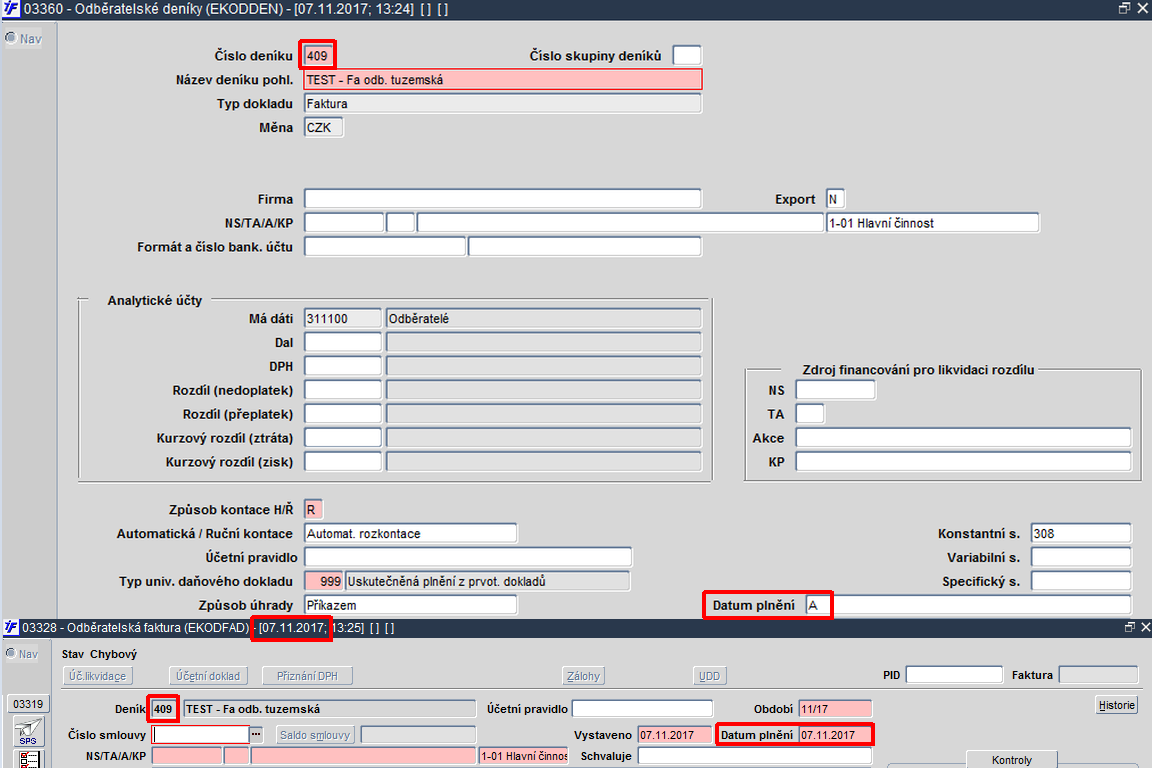 Obr. 03328/3 Automatické vyplnění položky "Datum plnění" aktuálním datem dle formuláře 03360 – Odběratelské deníky, kde je položka nastavena na hodnotu "A"