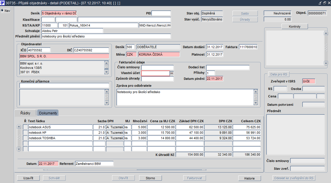 | Formulář nezobrazuje osoby, které mají odpovědnost a přístupy za objekt (např. za nákladová střediska, zakázky, smlouvy, rozpočty, atd.). |