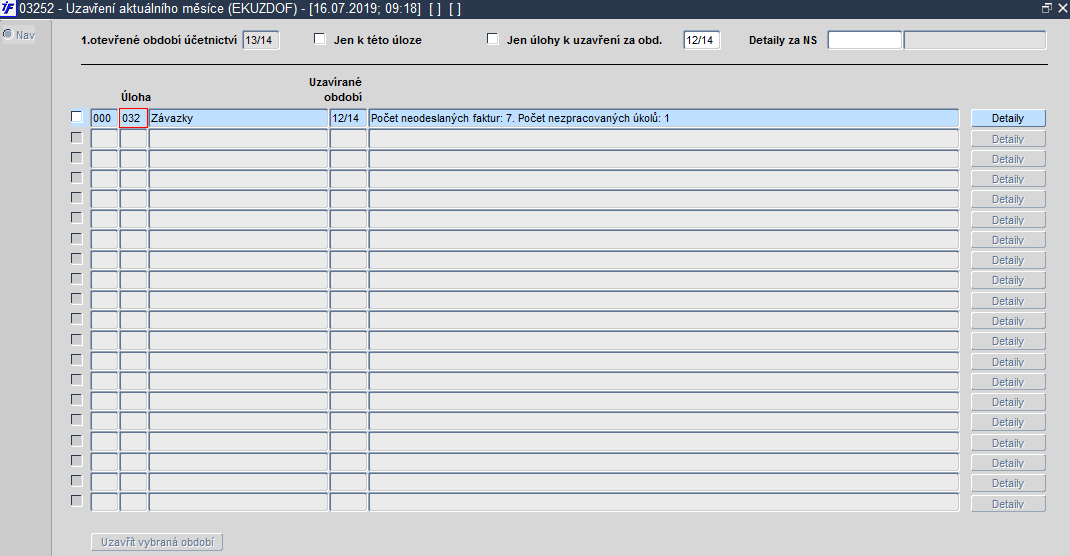 ). U úlohy 032 a 033 se po stisku tlačítka "Detaily" lze ještě rozhodnout, které doklady se budou prohlížet a následně přesouvat do dalšího období.