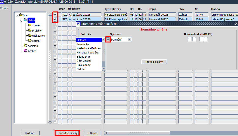 Hromadná změna platnosti zakázky funguje na těchto principech: