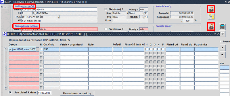 Pro každý rozpočet je možné nadefinovat odpovědné osoby. Po kliknutí na ikonu