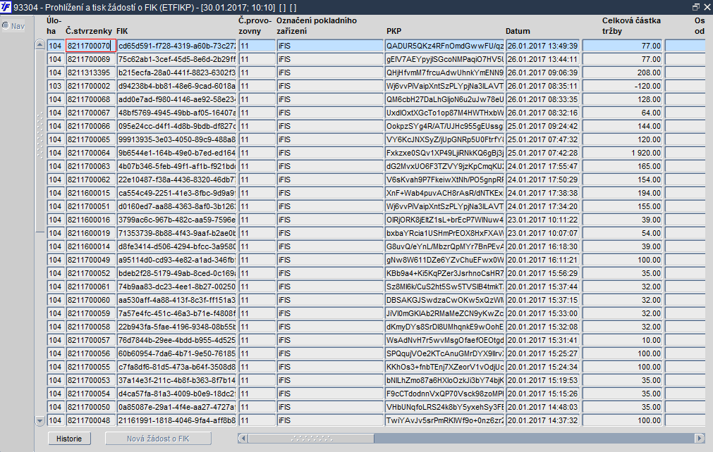 Formulář slouží k prohlížení požadavků EET a k prohlížení historie jejich zpracování. Jsou zde obrazy všech prvotních dokladů, u kterých vznikl požadavek na vygenerování fiskálního identifikačního kódu (FIK). Může se jednat o prvotní doklady z úloh iFIS* 035 - Pokladna, 104 - Zásoby/Prodej nebo z úlohy 103 - Zásoby / Příjem vráceného / reklamovaného zboží. U každého ze záznamů by měl být uvedený fiskální identifikační kód (FIK). V případě že zde uveden není, pak je zapotřebí zjistit důvod a následně iniciovat dodatečné vygenerování validního požadavku EET.