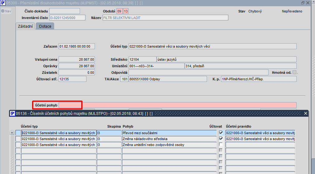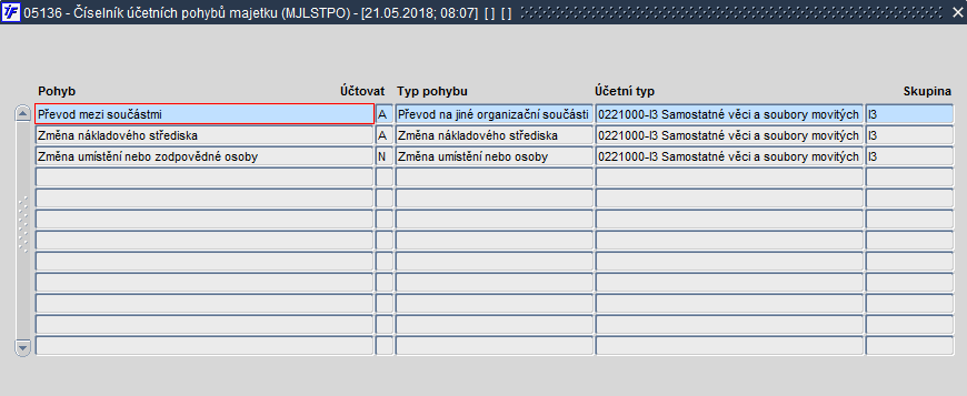Obr. 05136/1 Číselník účetních pohybů majetku