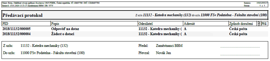 Obr. Příklad tisku sestavy 19101/09122 - Předávací protokol