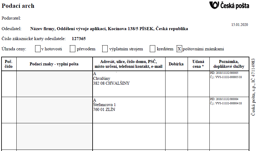 '''Obr.''' ''Příklad tisku sestavy [[19102 - Podací list České pošty|19102]]/[[Man09122|09122]] - Podací list České pošty'' | |||