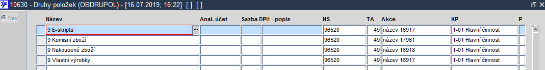 Formulář slouží k definování kategorie Druh ceníkových položek. Druhy položek jsou využívány k roztřídění ceníkových položek a tím následně ke zvýšení přehlednosti ceníku. Novou možností je řízení skladových zásob a skladů právě pomocí Druhů. Je- li nastaven příslušný lokální parametr, lze přijmout určitý Druh zásob pouze na vyjmenované sklady podle nastavení ve funkci 10615 - Definice vazeb.