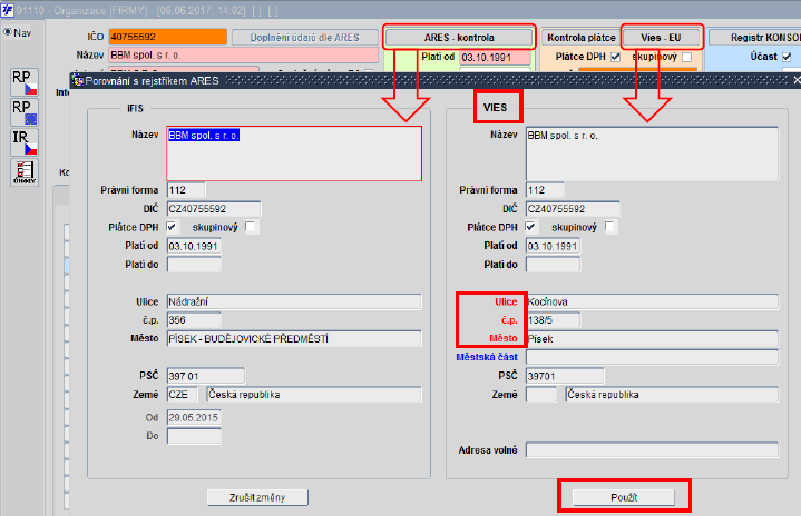 Obr. Přemístěná tlačítka a nové položky "Platnost vztahu od/do" viditelné po posunutí lišty vpravo