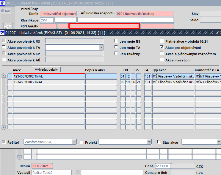 - zakázky do položky Akce klávesou pro Seznam hodnot vyvolá formulář 01207 - Listval zakázek, ve kterém je napevno zaškrtnuto zatržítko Jen moje zakázky
