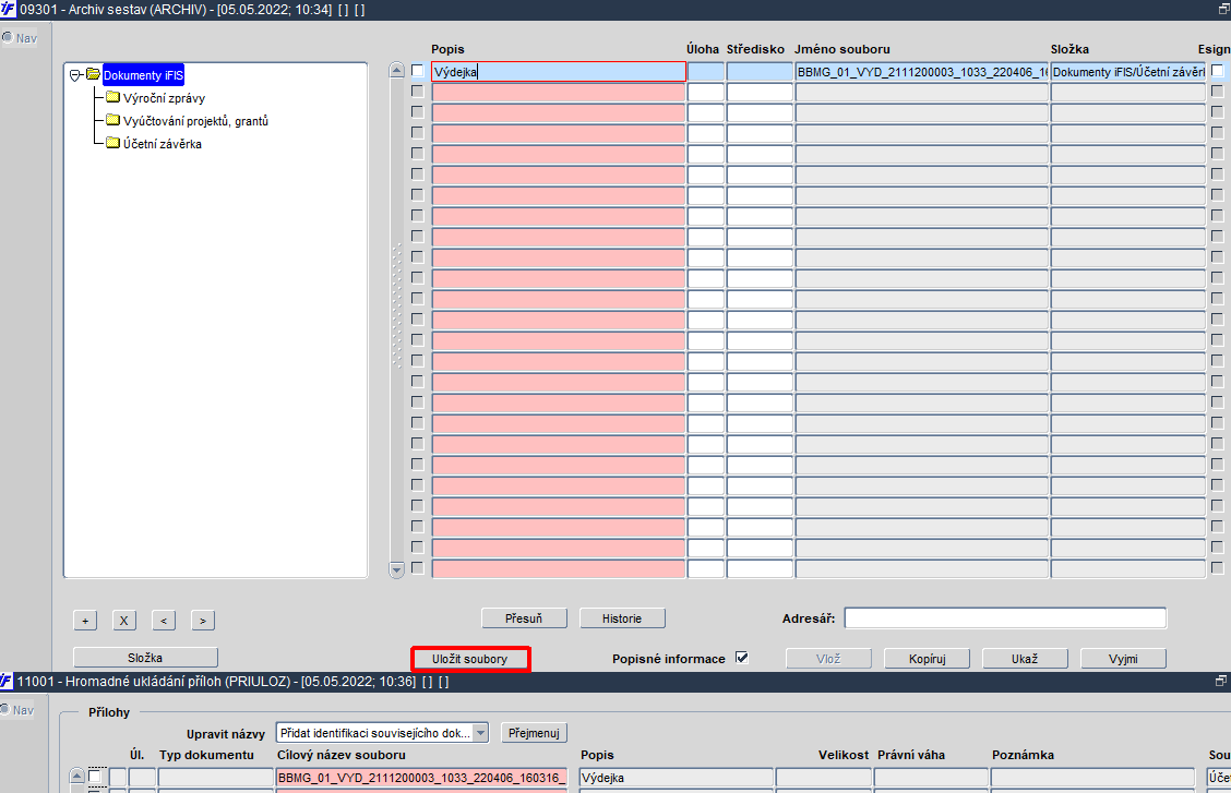 V iFIS zavedena možnost hromadného stažení vybraných dokumentů z iFIS/Archiv sestav do adresáře na lokální disk. Do formuláře 09301 - Archiv sestav doplněno nové tlačítko Uložit soubory, které vyvolá funkci 11001 - Hromadné ukládání příloh.