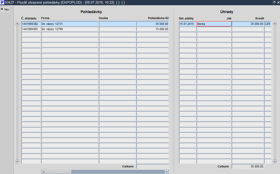 Tato funkce slouží pouze k prohlížení plně uhrazených pohledávek, které však byly uhrazeny až po datu splatnosti. V levé části obrazovky jsou nabízeny plně zaplacené pohledávky. Jejich položky se nevejdou do příslušné části obrazovky, proto levá polovina obrazovky roluje po těchto položkách pomocí klávesy pro Předchozí pole. V pravé části obrazovky se objeví úhrady pohledávky z levé části obrazovky až po stisku klávesy Další blok. Úhradou pohledávky může být řádek bankovního výpisu nebo pokladní doklad. Detail prvotních dokladů je možno prohlížet stiskem klávesy pro Výběr.