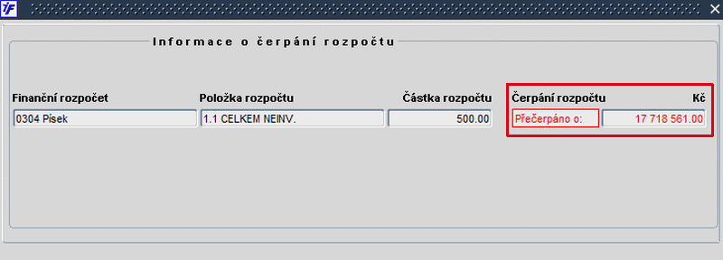 V případě přečerpání rozpočtu je uživatel informován tak, že se částka "přečerpání" zobrazí červenou barvou .