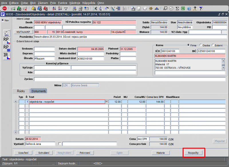 Obr. 30335/10 Detail objednávky - tlačítko "Neschválení"