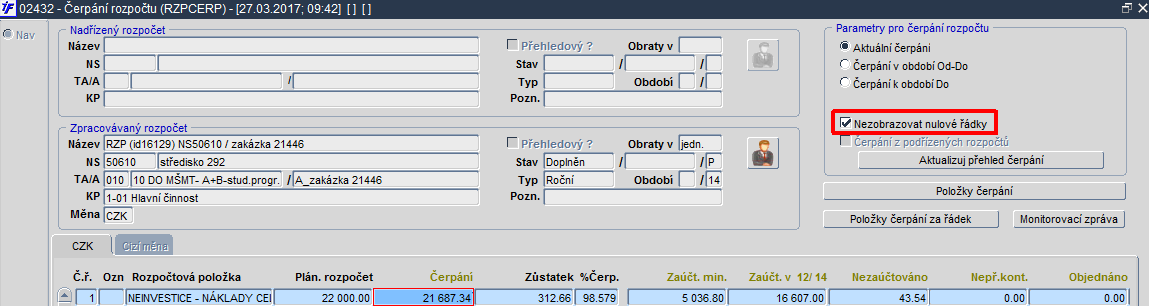 Zaškrtnutím zatrhávátka Nezobrazovat nulové řádky může uživatel odfiltrovat ze zobrazeného čerpání ty řádky rozpočtu, které nemají žádnou náplň a jejichž hodnota je nulová. Tuto možnost využije uživatel v případě delší rozpočtové struktury, ze které je v daném rozpočtu využita pouze část.