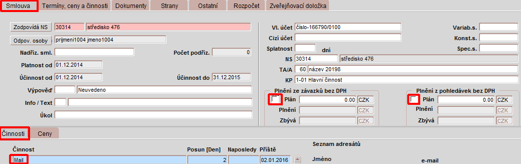 • Termíny, ceny a činnosti - eviduje všechny důležité termíny vyplývající ze smlouvy (ke každému termínu lze evidovat požadavky na automatické upozornění odpovědných osob na blížící se termín), upozorňování se provádí pomocí e-mailů zasílaných na adresy odpovědných osob, lze také definovat požadavek na automatické generování dokladu do iFIS* Finance, jsou tím např. zajištěny včasné a správné podklady pro provedení plateb nebo podklady pro DPH; rozhodující jsou v tomto případě očekávané finanční operace evidované na záložce "Ceny"