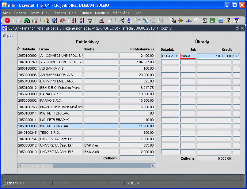 Tato funkce slouží pouze k prohlížení plně uhrazených pohledávek, které však byly uhrazeny až po datu splatnosti. V levé části obrazovky jsou nabízeny plně zaplacené pohledávky. Jejich položky se nevejdou do příslušné části obrazovky, proto levá polovina obrazovky roluje po těchto položkách pomocí klávesy pro předchozí pole. V pravé části obrazovky se objeví úhrady pohledávky z levé části obrazovky až po stisku klávesy další blok. Úhradou pohledávky může být řádek bankovního výpisu nebo pokladní doklad. Detail prvotních dokladů je možno prohlížet stiskem klávesy pro výběr.