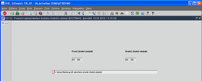 Před uzavřením období se stává, že je nutno zpracovat doklady do něho zapsané a současně již pořizovat nové doklady do příštího období. Tato situace je řešena tím, že je možno otevřít druhé období pro úlohu 031 Banka. Poté je při pořízení nového dokladu předvyplněno druhé otevřené období, avšak je možno na dokladu toto přepsat na první období nebo na kterékoli vyšší. Při uzavření prvního období formulářem 03152 - Měsíční závěrka banky se automaticky druhé otevřené období stane prvním a otevřeno zůstává pouze toto jedno. Otevření druhého období se provede vstupem do formuláře klávesou "Výběr"