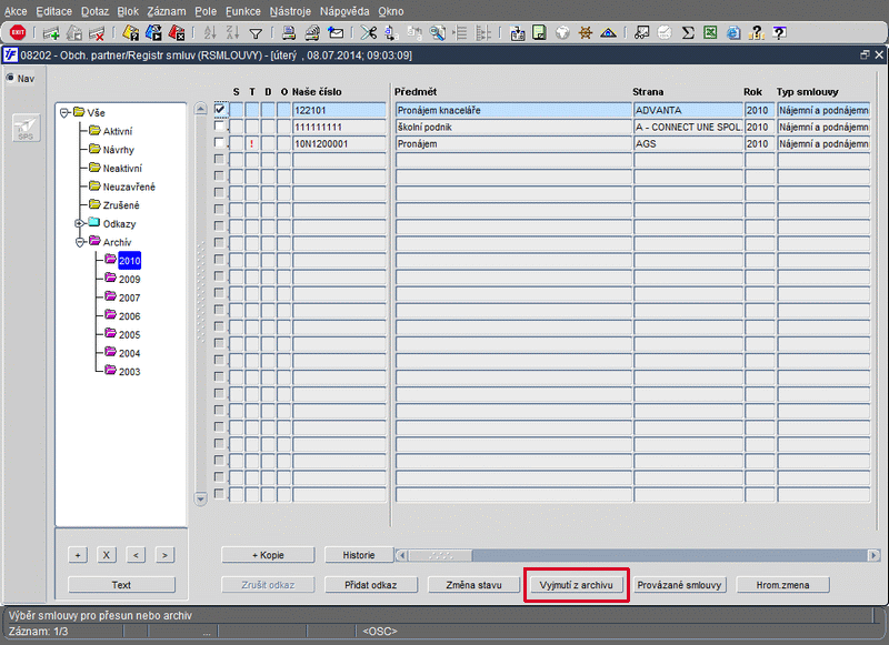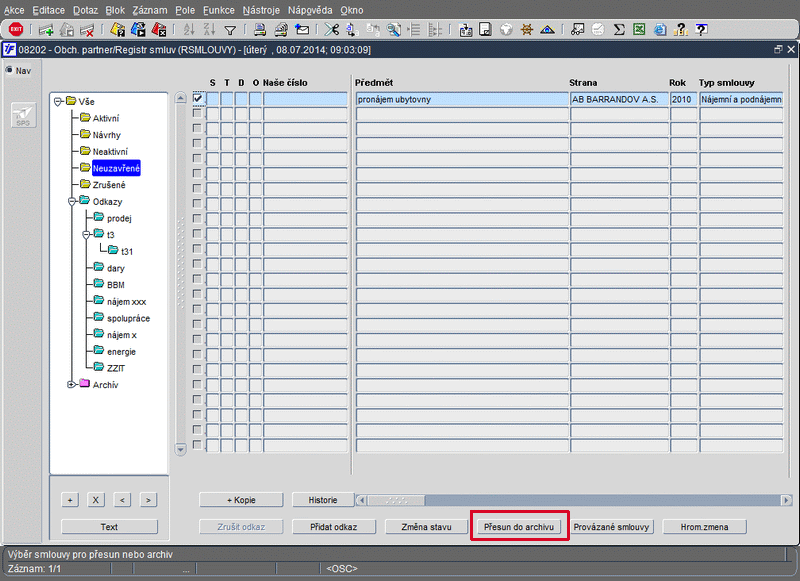 - Přesun do archivu (Vyjmutí z archivu) - přesune smlouvu do archivu/vyjme smlouvu z archivu