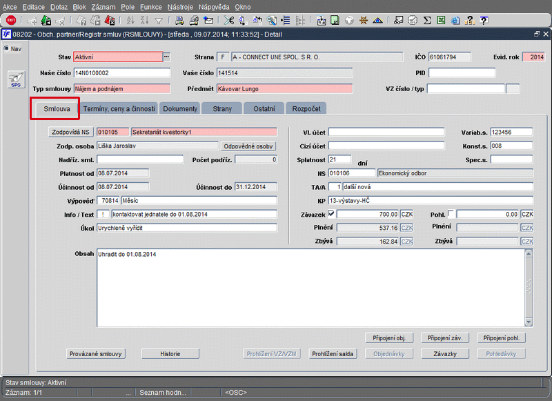 - Info - příznak důležitosti informace, zobrazuje se v přehledu smluv, jestliže alespoň jeden záznam je označen jako důležitý