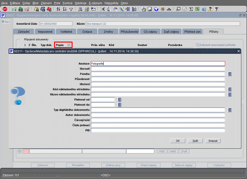 - Při zapnutém "zatržítku" Popis - při vložení každého nového dokumentu se otevře formulář 00311 - Metadata pro centrální úložiště (doplňující údaje pro centrální úložiště)