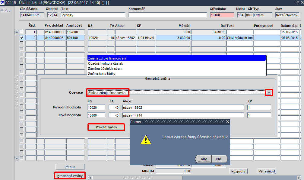 Obr. 02115/6 Provedení hromadných změn zdroje financování na účetním dokladu